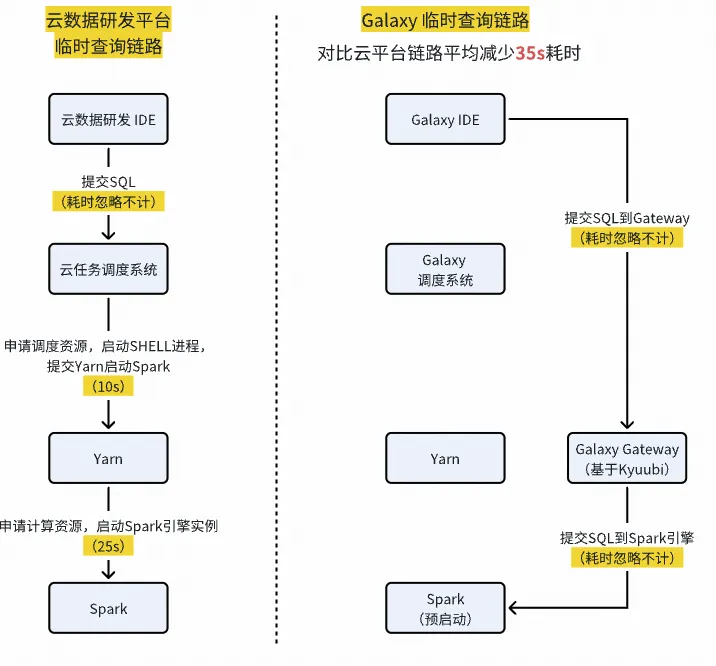 通过简化调用链路+Spark Driver预启动等查询加速技术,平均每个Query可以比原云数据研发平台固定节约35s+。