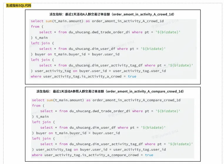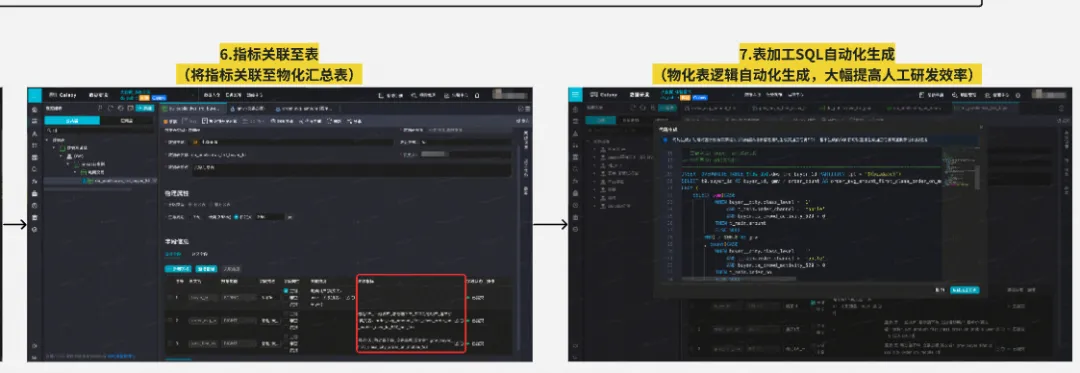 从上图我们也可以看到,原子口径的变更影响非常大,即使可以基于血缘进行变更握手管控,人工修改逻辑也容易改错或遗留。因此我们实现了自动化指标代码生成的能力,基于原子口径自动化生成指标及其物化表的加工逻辑。