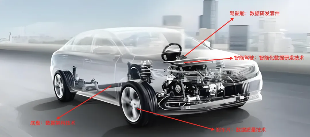 24年立项开始至今,我们主要专注在4个最核心能力的建设,分别为:数据研发套件、数据架构技术、数据质量技术、智能化数据研发。如果把数据研发平台比喻成一辆汽车,那么这四部分的定位如下图所示: