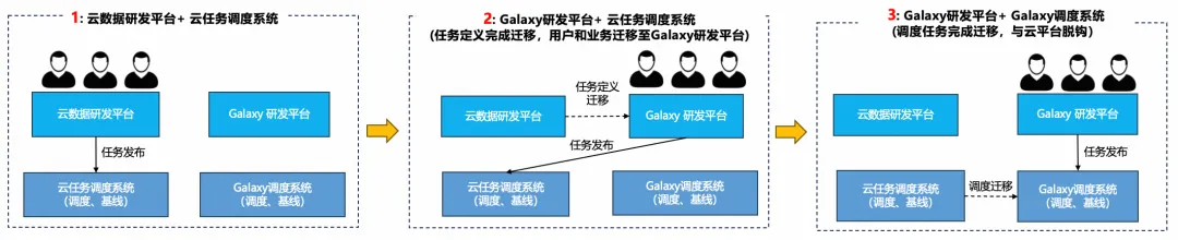 由于调度系统的故障风险极大,一旦异常很可能由于依赖错乱导致数据异常或停止调度导致的数据产出延迟。因此我们将Galaxy研发套件的平台层迁移和调度层迁移进行解耦,以便将调度系统的迁移节奏放缓。
