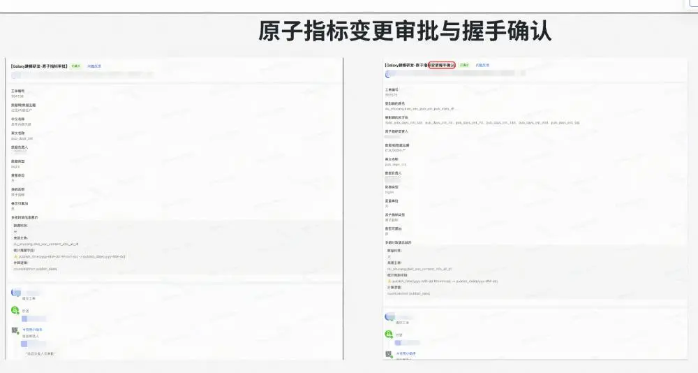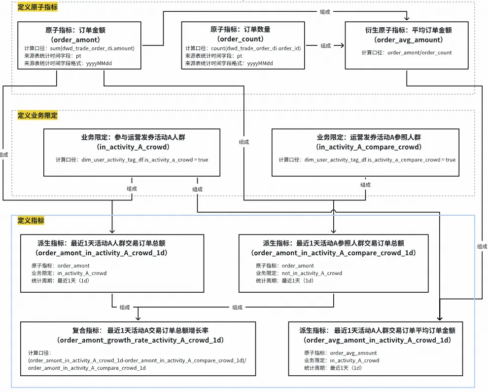 其中最为关键部分为“指标建模”。我们将指标的口径组成拆成了三部分组成:原子指标、业务限定、统计周期,同时在其物化到表上的时候再确定统计粒度。通过原子要素的组合定义指标可以确保同样的指标在公司全局只会有一个,以及标识出不同的汇总表、应用表中的指标是否为同一个。另外当原子口径发生了变化,系统也可以根据血缘关系找到受影响的指标和表,让owner进行握手确认,确保口径变更一致性。例如下图所示: