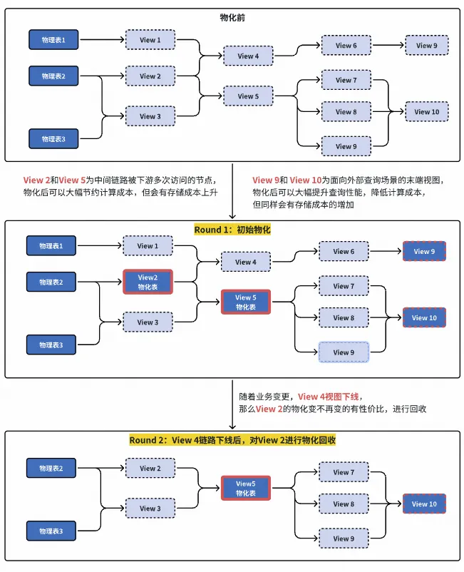 通过视图或参数化视图进行整条数据链路的构建,那么整条链路就完全不需要任何存储成本,计算成本也仅在视图查询时才发生。但这样会导致一个问题,当视图逻辑复杂,嵌套层级多时,查询效率非常低,且对相同视图的查询都需要重新计算。因此我们需要对一些关键的视图进行物化,物化后的视图,在查询时可以直接访问其物化表,实现查询性能的大幅提升。