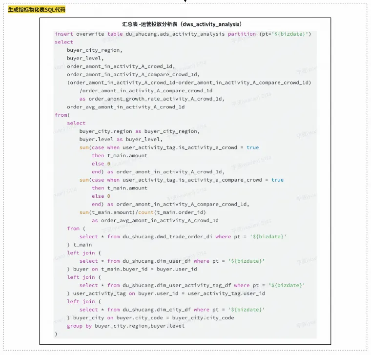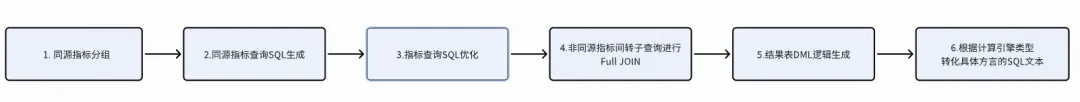 将指标按来源表分组,并将其的组成原子要素(原子指标+业务限定+统计周期+统计粒度)进行SQL逻辑的组装、优化、方言翻译,具体流程为: