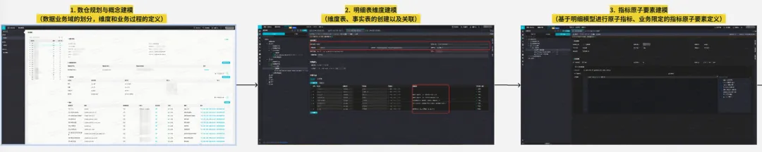 目前已完成数仓规划->概念建模->明细表维度建模->指标建模->指标代码自动化生成->汇总表代码自动化生成的Onedata规范建模研发全流程,产品效果如下: