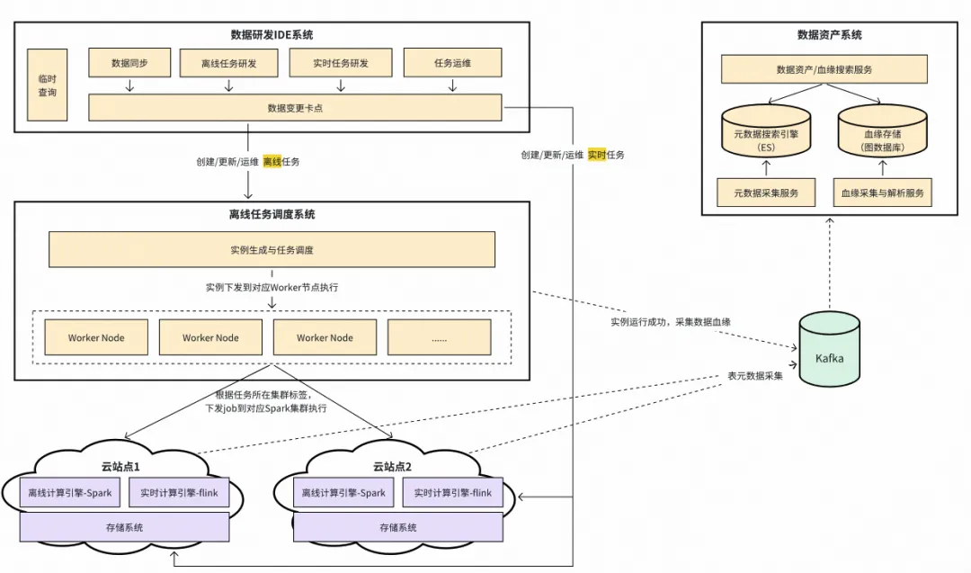 数据研发套件包含数据研发IDE、数据资产系统、离线任务调度系统三部分,在平台中的定位类似于“汽车的驾驶舱”,为数据工程师提供丰富的工具集,控制全公司的数据流动与计算。整体系统架构如下图所示: