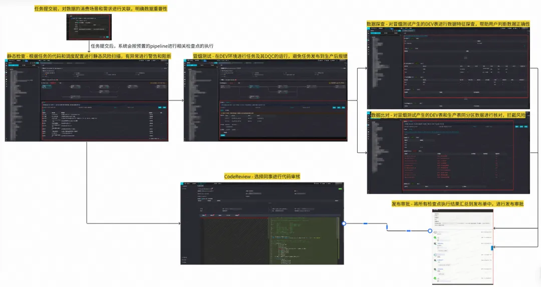 目前已经完成了完整的变更管控流水线的能力,主要功能包括:消费场景打标、静态风险扫描、Code Review、冒烟测试、数据探查、数据比对、发布审核。产品效果如下所示: