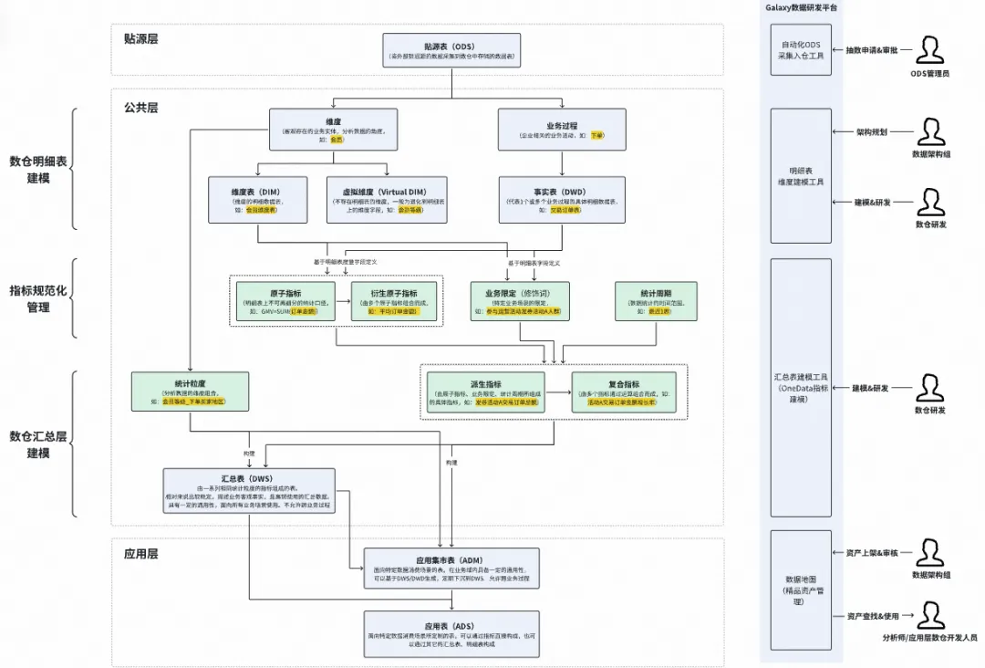 Galaxy数据研发平台基于“Onedata”的数据架构方法论,建立了统一的数据采集和生产规范,使数据的新增更加合理、易用,提高数据的复用度、研发效率、交付质量,降低使用成本。这是一种“内啡肽”式的数据建设,前期需要花费一定时间进行数据模型的设计并遵守数据研发规范,但从业务的长远发展来看,这是必须要走的一步。