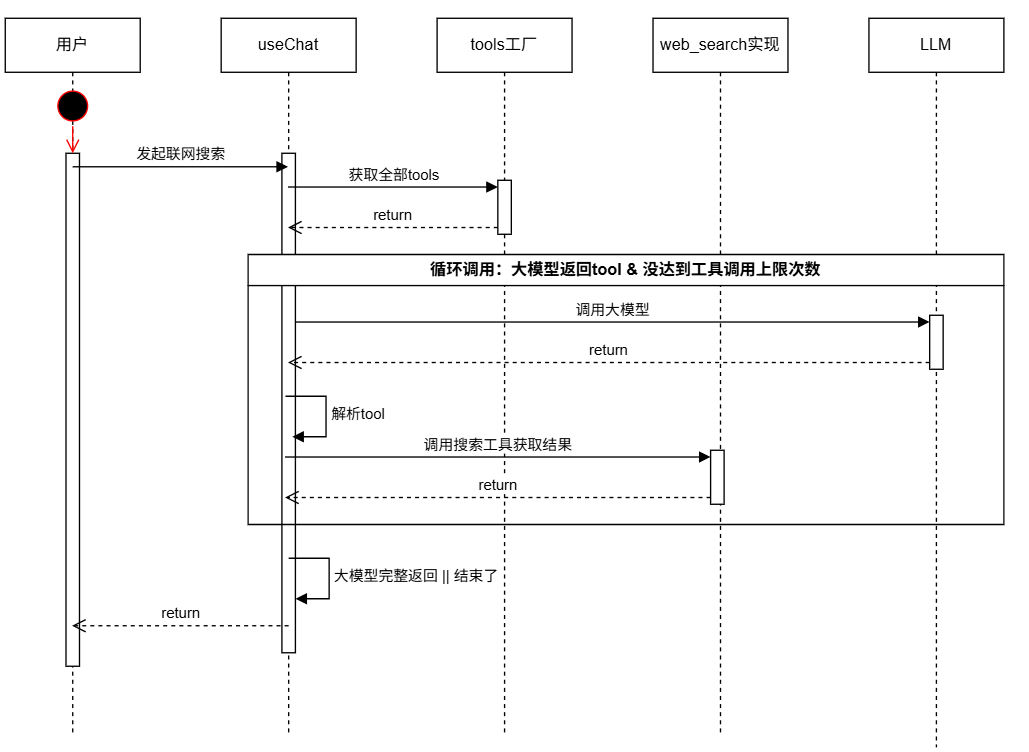 深度搜索实现的关键:循环调用大模型,直到大模型不再请求搜索工具,或者达到最大搜索次数。