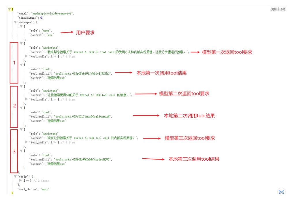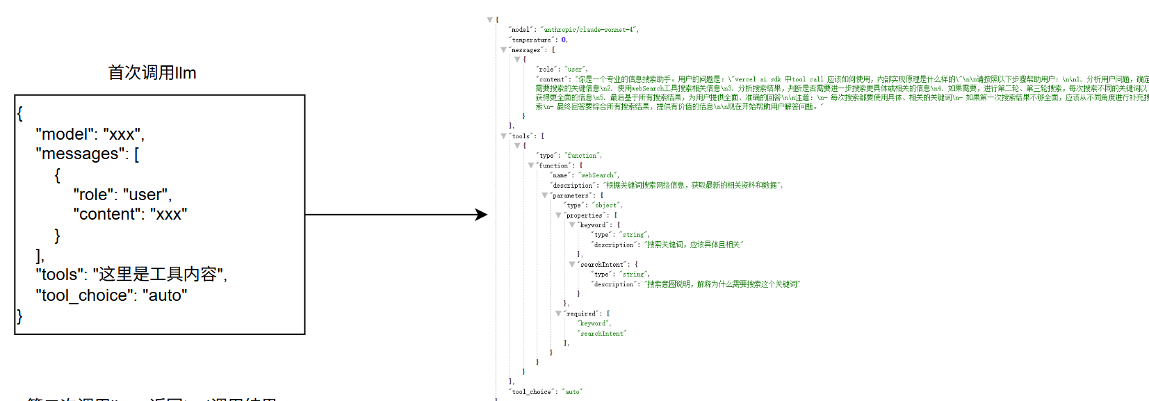 }调用llm的数据参数可参考图片:包含了两次工具调用