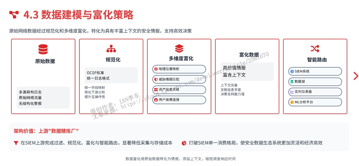 规范化:将不同来源、不同格式的日志数据转换为统一的、标准化的模式。开放网络安全模式框架(OCSF)是一个新兴的开源标准,旨在统一不同安全工具的日志格式,从而简化下游的分析和关联。将各种来源的日志映射到标准模型,可以极大地提高数据的一致性和互操作性。