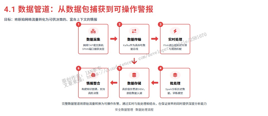 现代安全数据管道是一个端到端的系统,其目标是将原始网络流量转化为可供决策的、富含上下文的情报。其典型流程如下: