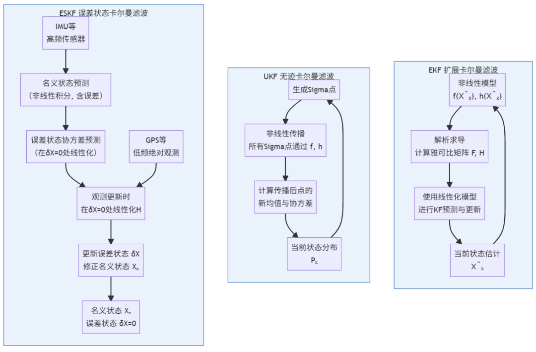 特性 | 扩展卡尔曼滤波 (EKF) | 无迹卡尔曼滤波 (UKF) | 误差状态卡尔曼滤波 (ESKF) |
