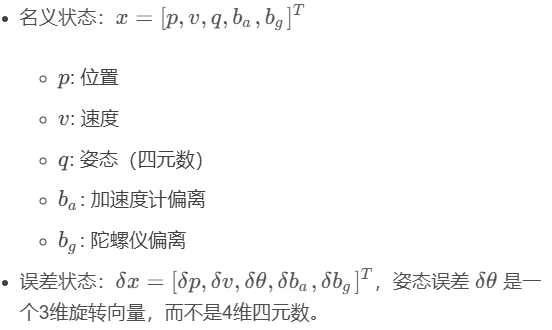 估计对象 | 完整的系统状态 x{x}x | 完整的系统状态 x{x}x | 误差状态 δx\delta{x}δx |
