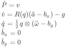 这里 R(q)是从四元数到旋转矩阵的转换,g是重力向量,这个过程是确定性的(忽略了噪声),会产生漂移。