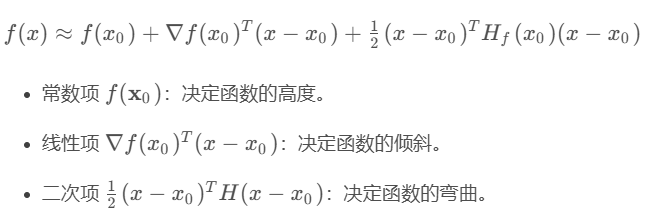 - 精确描述局部曲率:梯度(一阶导)告诉我们函数在某个点“向上”或“向下”的方向,但它无法告诉我们这个坡度是越来越陡还是越来越缓;Hessian矩阵(二阶导)则告诉我们坡度是如何变化的,即曲率,回答了沿着某个特定方向移动,梯度会如何变化的问题。