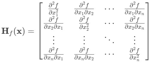 对于一个 n 元函数 f(x1,x2,...,xn),其在点 x 的Hessian矩阵 H 定义为: