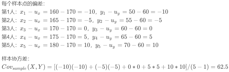 身高均值 :u_x = (160+165+170+175+180)/5=170 体重均值 :u_x =(50+55+60+65+70)/5 =60