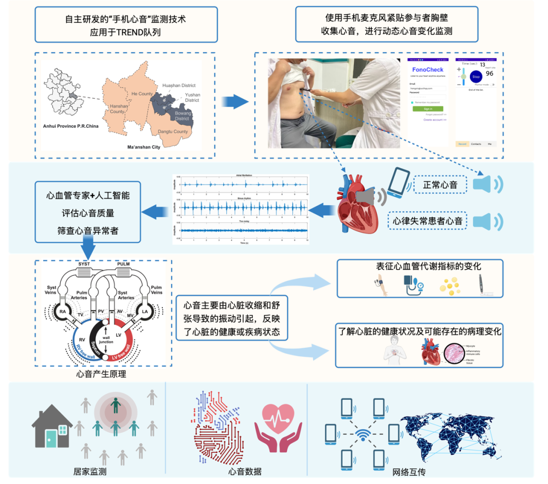 随着近年来传感和通信技术快速发展,智能手机逐渐成为健康评估的重要工具。研究团队创新性地开发了智能心音采集技术(FonoCheck系统),捕捉人体的心脏声音信号,将随身携带的手机升级为数字化、便携式的“健康监测入口”。为了将心音大规模应用于健康监测,在自主研发的心音监测技术基础上,研究人员探讨了利用智能手机监测心音的可能性:①中国智能手机用户已超过10亿,其中18岁及以上成人群体智能手机使用率接近90%。因此,利用智能手机进行心音监测,无需额外购买专用设备,具有经济性和便利性;②相较于贴片式、佩戴式等其它监测方式,手机监测心音避免了因长时间与身体接触所带来的不适感、掉落等问题,同时操作简便,适用场景广泛;③智能手机通过网络能实时传输数据,支持远程诊断,且具备较高的可视化界面,为自我监测心血管健康提供了有效手段。在此次研究中,团队在自主组构建的TREND队列【1】中,对超过5000人的心音数据进行采集和算法分析,并结合心血管医生判定,实现了对心律失常患者(房颤)的高效筛查。