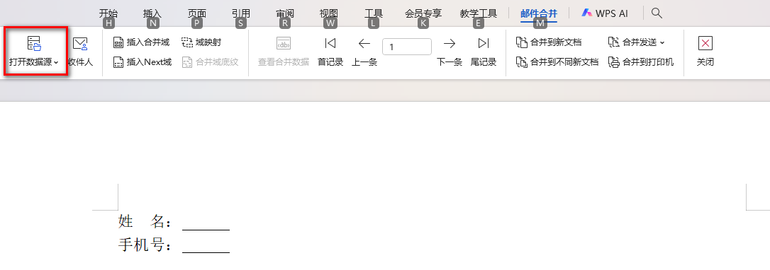 打开「邮件合并」菜单后我们可以需要打开数据源