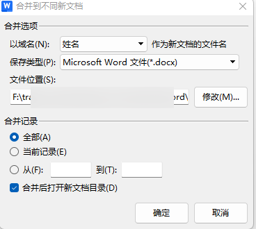 我这选择的是合并到不同新文档,配置项中可以选择域标题作为每一个新文档的文件名称,文件类型可以选择自己需要的文件类型。