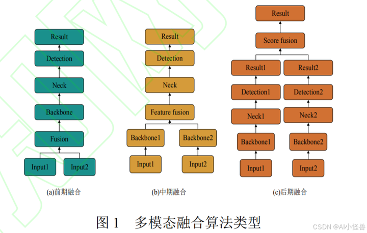 在目标检测(object detection)领域,数据融合策 略至关重要,尤其是在整合多模态数据和提升检测性 能方面。根据数据整合的时间点和方式,融合策略可 分为前期融合(early fusion)、中期融合(mid fusion) 和后期融合(late fusion)。每种策略在目标检测任务 中都有其独特的应用和优势。多模态融合算法类型如 图 1 所示。