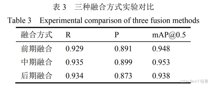 实验对比:由表 3 可以看出,在三种融合方式中,在召回率, 精确率和平均精度三种指标中,中期融合的结构都要优于前期融合和后期融合,因此本文在中期融合的基础上对模型进行改进。