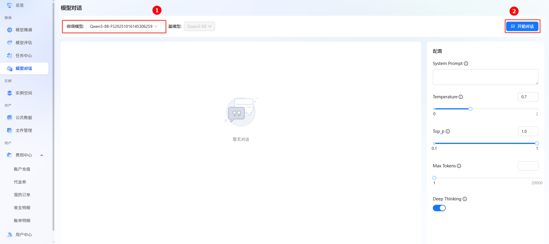 1. 单击页面左侧导航栏“模型对话”,进入模型对话页面。