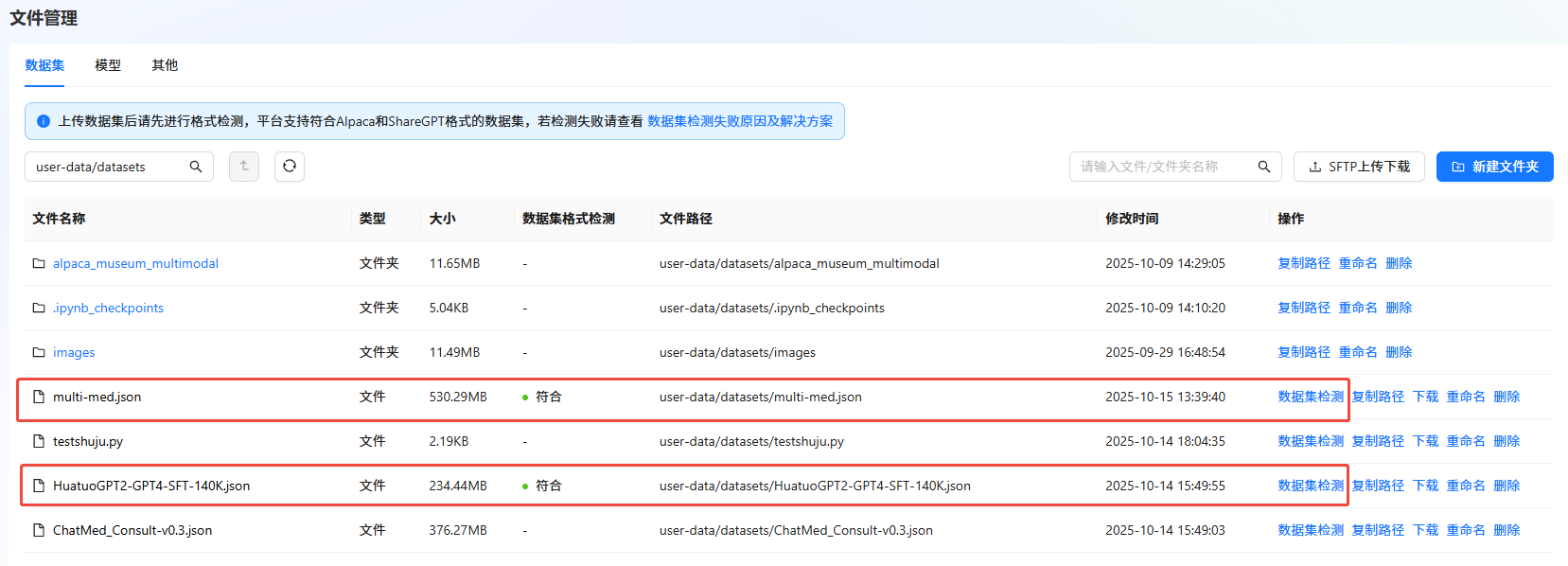 回显信息如图③所示,说明数据格式转换成功,且转换后的数据存放在/datasets/multi-med.json中,即原数据集文件ChatMed_Consult_Dataset经格式转换后生成新的数据集文件multi-med。