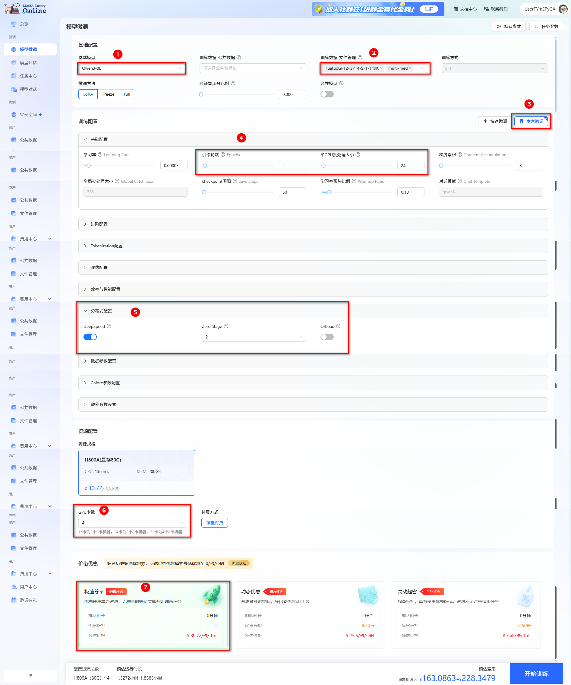 ○ 分布式配置:打开“DeepSpeed”开关(如图⑤)。