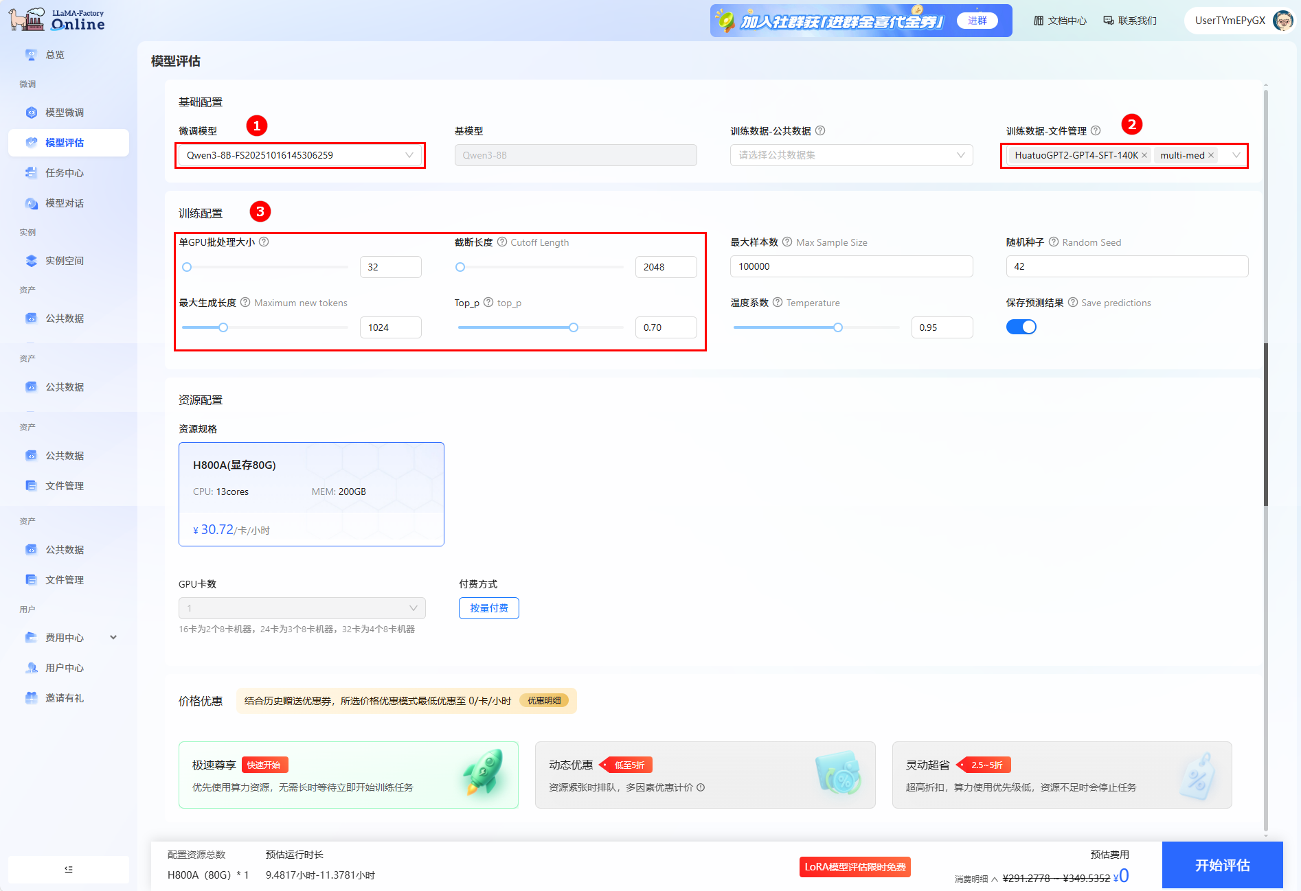 2. 微调模型选择上一步骤微调后的模型(如图①),评估数据集为ChatMed_Consult_Dataset(multi-med)和HuatuoGPT2-SFT-GPT4-140K(如图②)。然后配置如下参数(如图③):