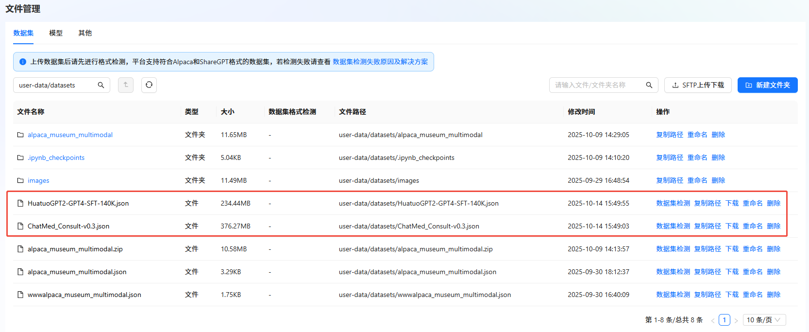 1. 下载数据集。数据集下载完成后,需上传至文件管理。具体操作,可参考SFTP上传下载 | Llama-Factory Online docs完成数据集上传。