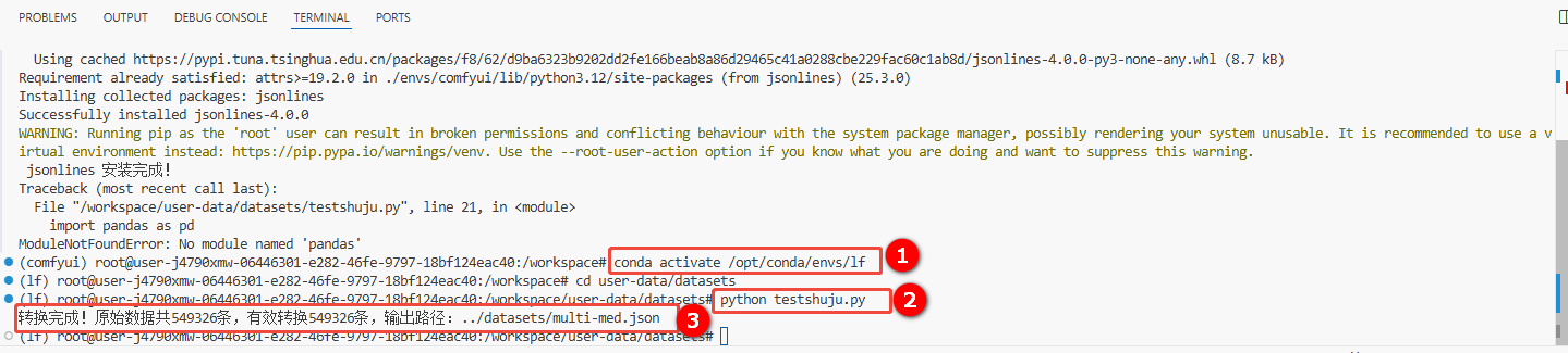 e. VSCode页面,新建一个终端,依次执行以下命令,进行数据格式转换(如图①和②)。