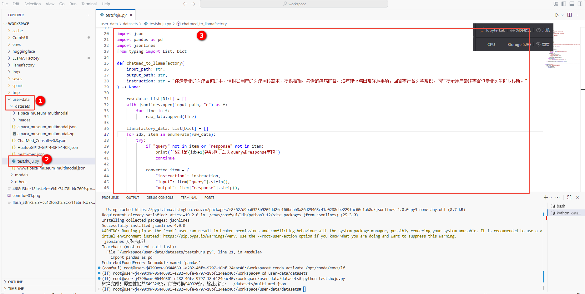 d. 在VSCode页面左侧user-data/datasets目录下(如图①)新建一个.py后缀的文件(如图②),然后复制以下命令至文件中(如图③)。