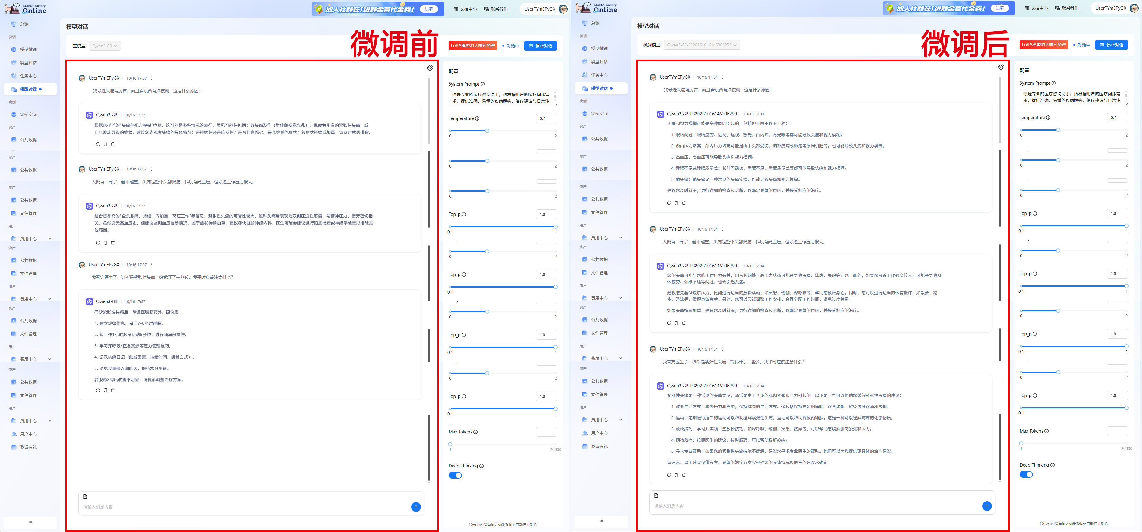 现在,通过LLaMA-Factory Online平台,我们只需要2小时,就能基于CareGPT和Qwen3-8B模型,系统性地构建一个真正“懂症状、能判断”的智能医疗助手。实际效果对比如下: