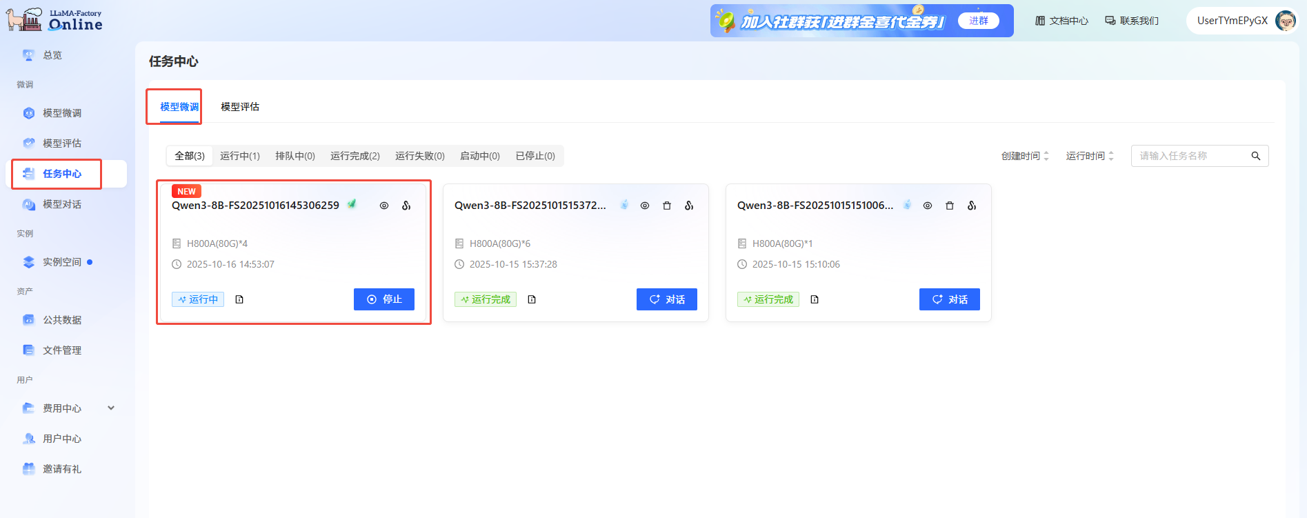 3. 通过任务中心查看任务状态。 在左侧边栏选择“任务中心”,在“模型微调”页面即可看到刚刚提交的任务。