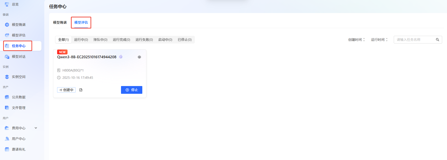 3. 可以在“任务中心->模型评估”下看到评估任务的运行状态。