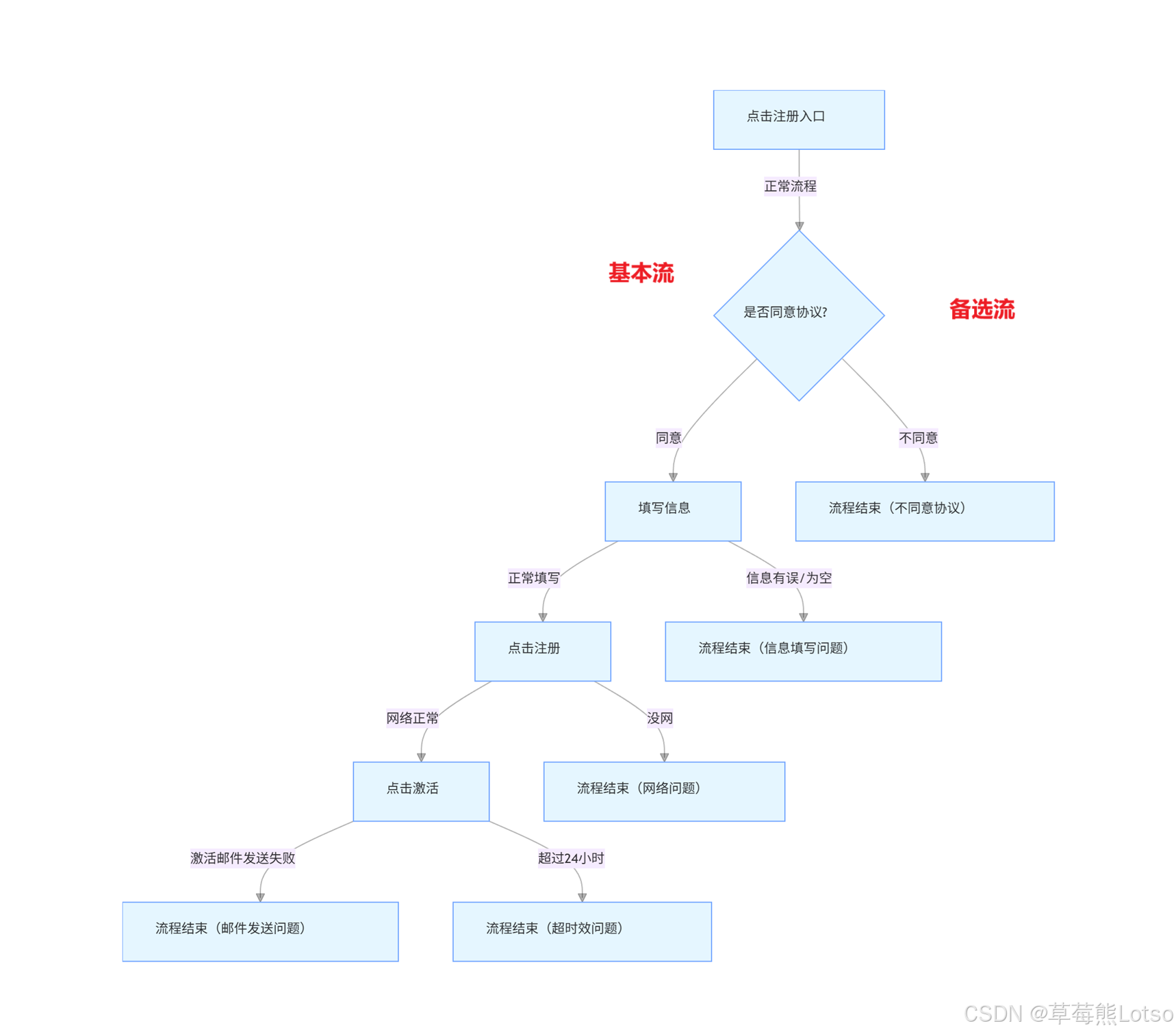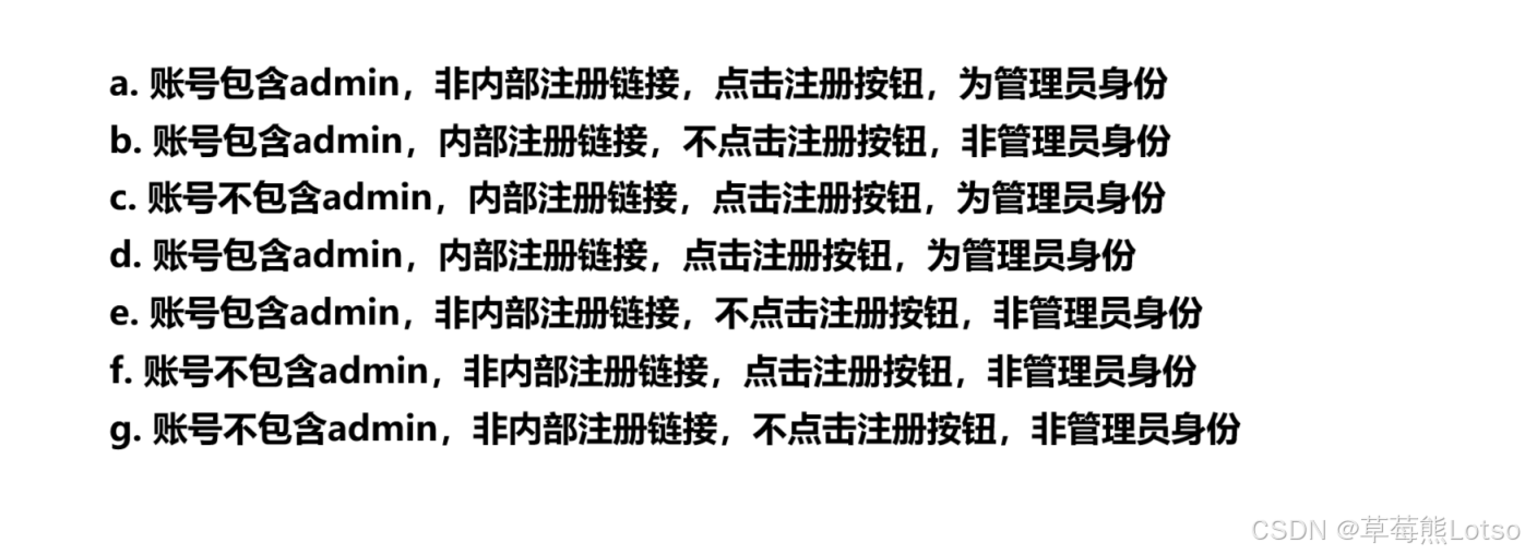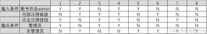 通过具体的方法能够将测试用例设计的更加完整和规范。 需求中会存在各种各样的场景,现在我们把需求改成如下的要求: 用户输入的账号中包含admin字符,或者通过内部链接进入注册页面,提交注册按扭成为管理员身份;反之无管理员身份。