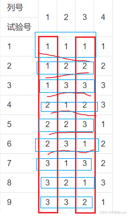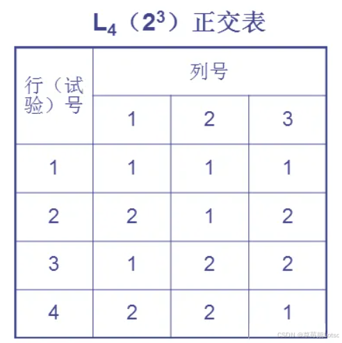如图最简单的正交表是L(4)(2(3)),含意如下:“L”代表正交表;L 下角的数字“4”表示有 4 横行,