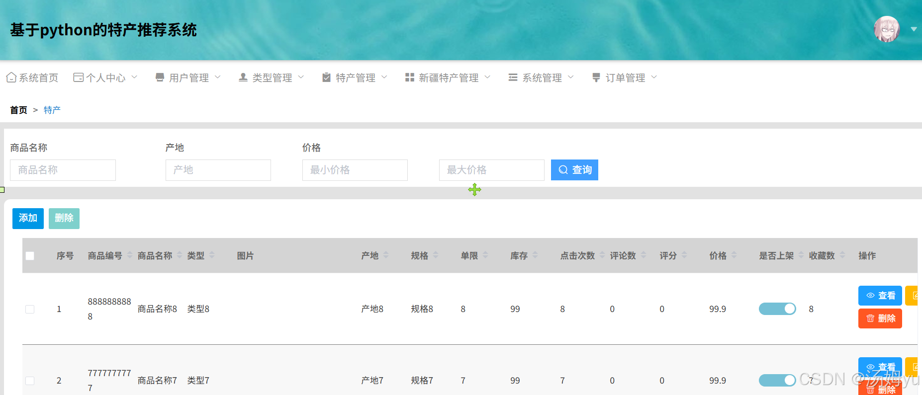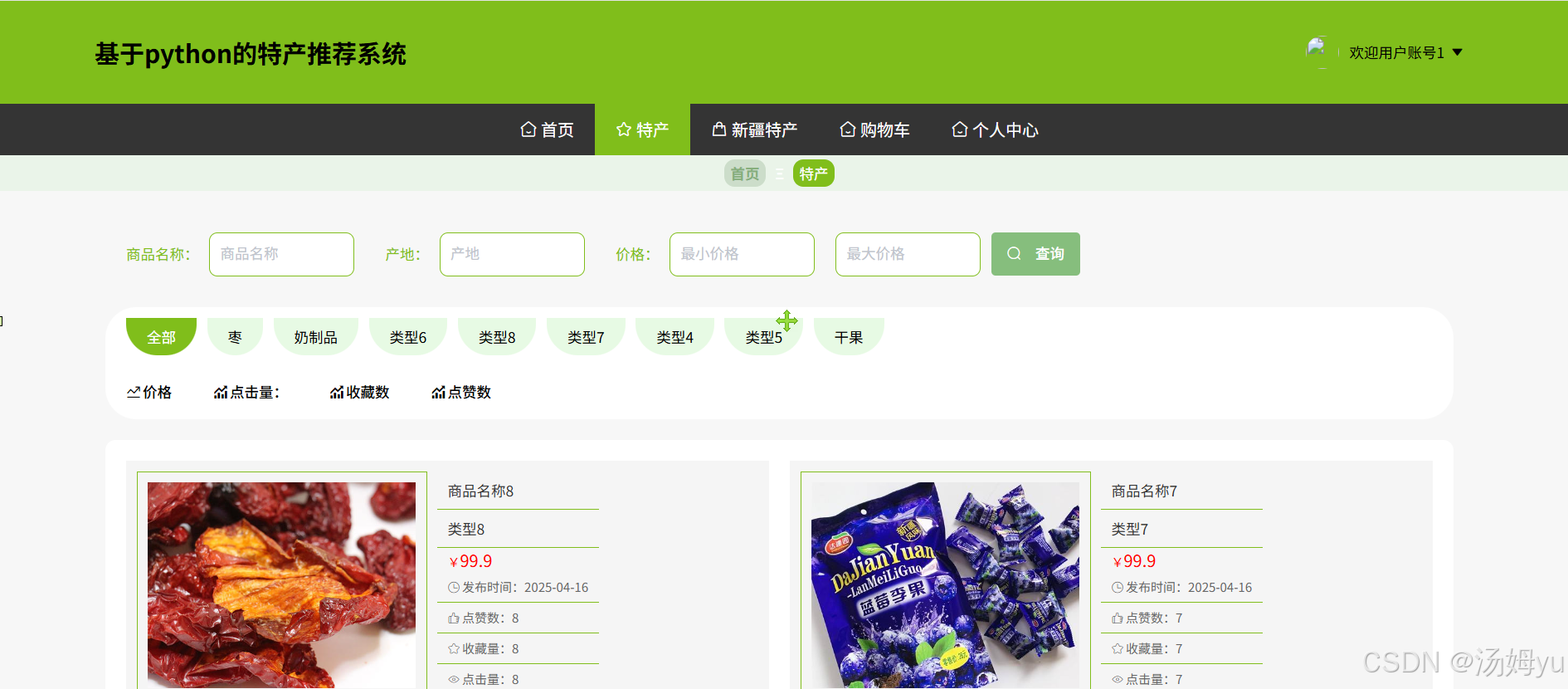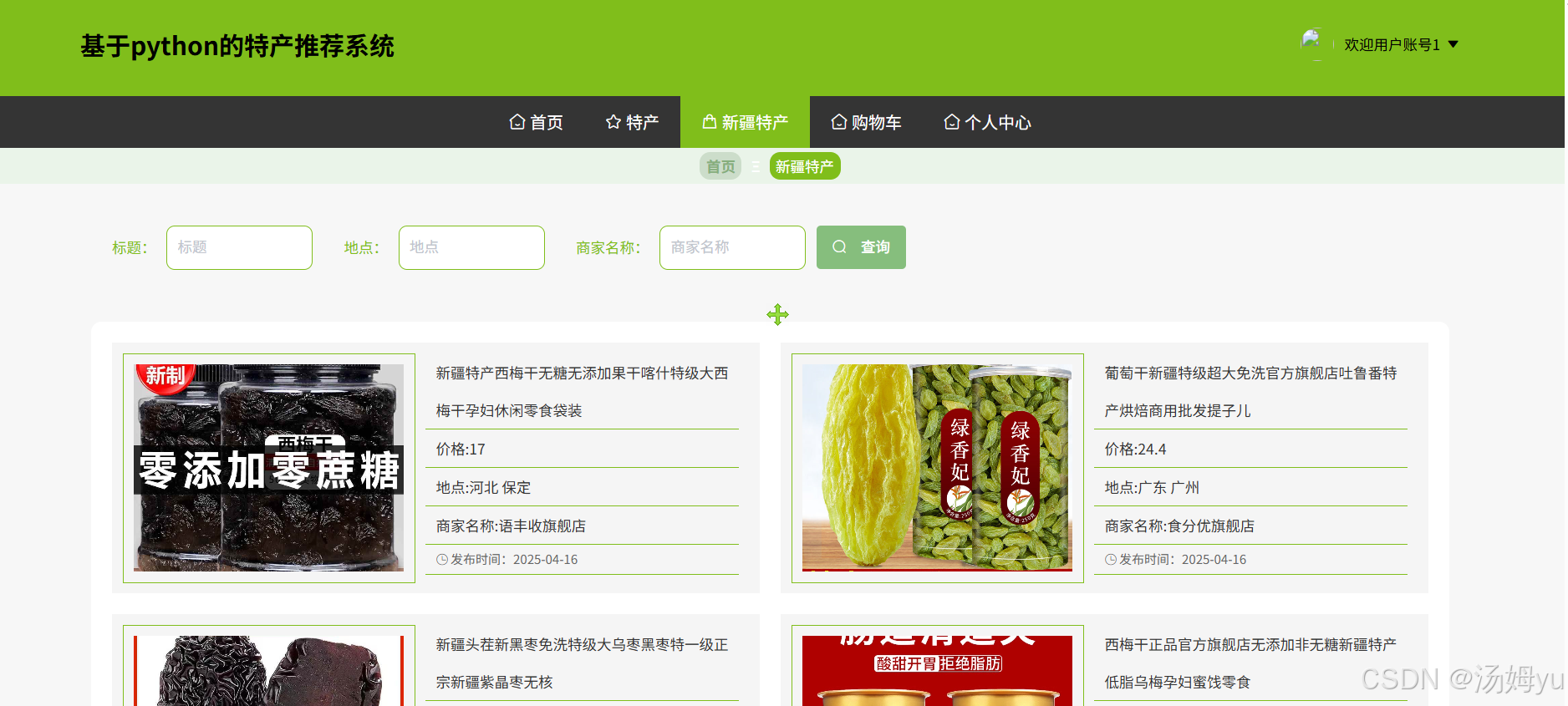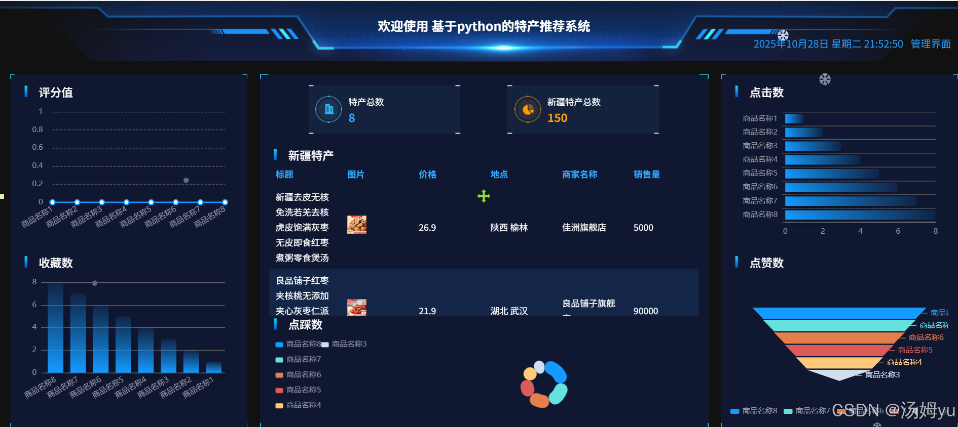 在学术研究层面,基于 Python 大数据的特产推荐系统融合了计算机科学、数据科学、市场营销学等多学科知识,为跨学科研究提供了新的实践范例。利用 Python 强大的数据处理能力,对海量的特产数据以及用户行为数据进行深度挖掘与分析,能够探索出适用于特产领域的用户兴趣建模方法和推荐算法优化策略,丰富和完善现有的推荐系统理论体系。同时,该研究有助于深入理解用户购买特产的决策过程和影响因素,为消费者行为学研究提供新的视角和数据支持,推动相关学科理论的创新发展。对于消费者而言,此系统能够根据其历史购买记录、浏览行为、地理位置等多维度信息,精准推荐符合其口味和需求的特产,节省消费者在海量特产中筛选的时间和精力,提升购物效率和满意度,让消费者轻松选购到心仪的特色产品,增强旅游消费体验。从特产商家角度,系统可以帮助商家深入了解消费者的偏好和市场需求,实现精准营销。商家能够根据推荐反馈调整产品策略,优化产品种类和库存管理,提高产品的市场适应性和竞争力,增加销售额和利润。对于特产产业整体发展,该系统有助于打破地域限制,扩大特产的市场覆盖范围,促进特产的流通和销售,推动特产产业的规模化、标准化发展。同时,通过挖掘特色特产,弘扬地域文化,提升地方特产的知名度和美誉度,实文化与经济的良性互动,助力地方经济发展和乡村振兴。
