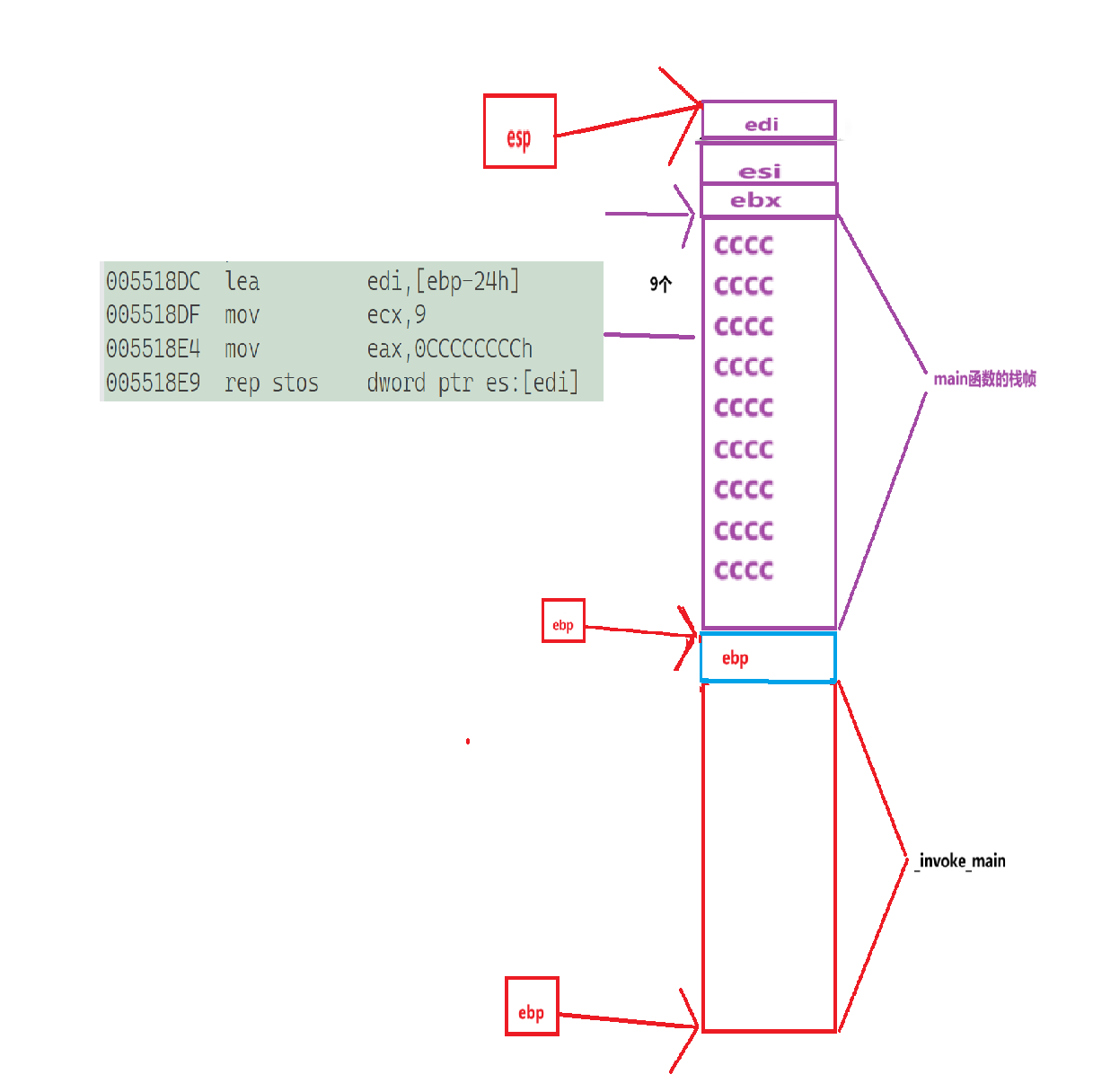 //4.将从ebp-24h到ebp之间ecx个4个字节的数字初始化为0xCCCCCCCC