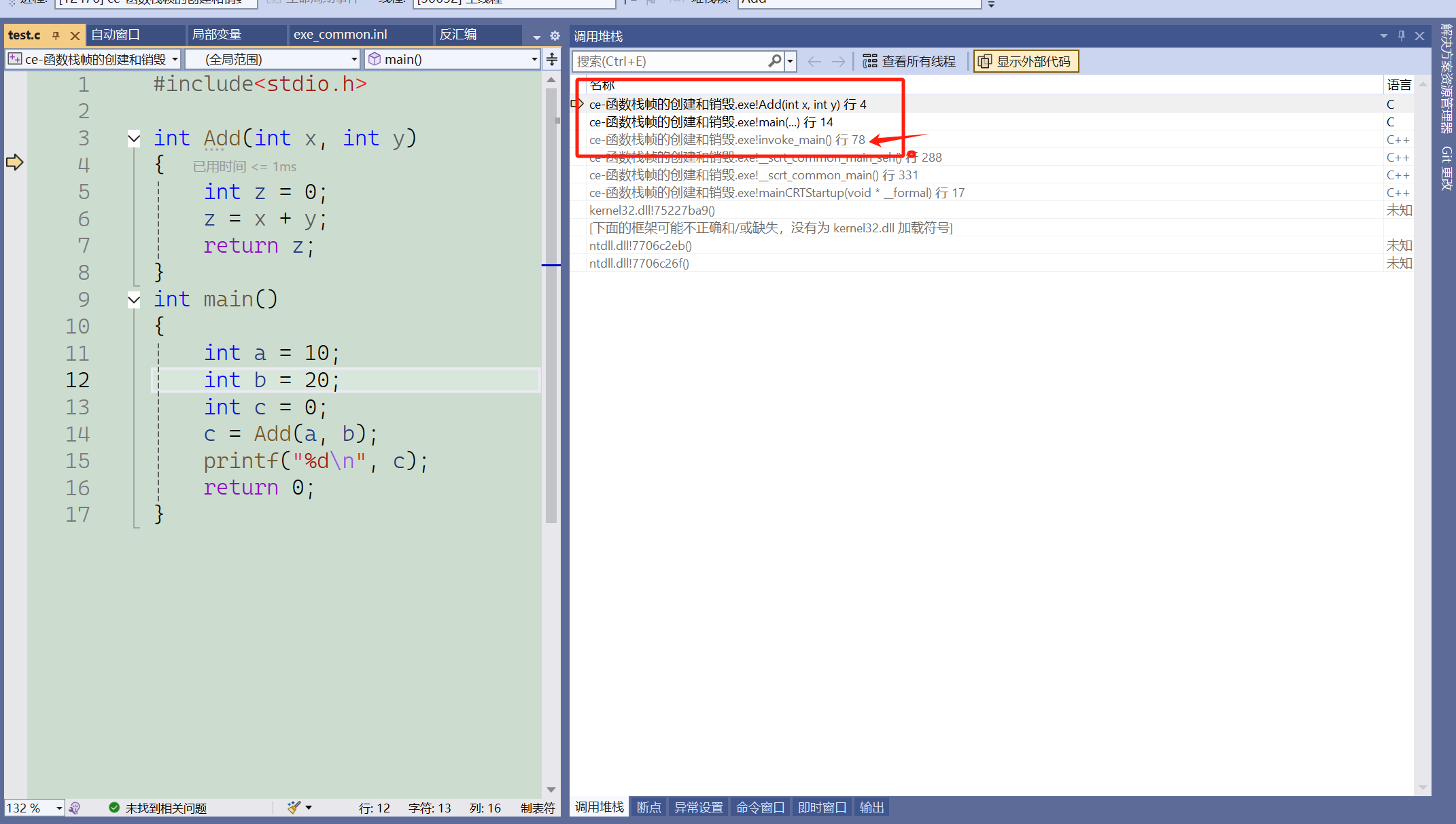 }这段代码我们在vs2022上调试的话,调试进入add函数后,我们就可以观察到函数的调用堆栈(右击勾选,显示外部代码) ,如下图所示