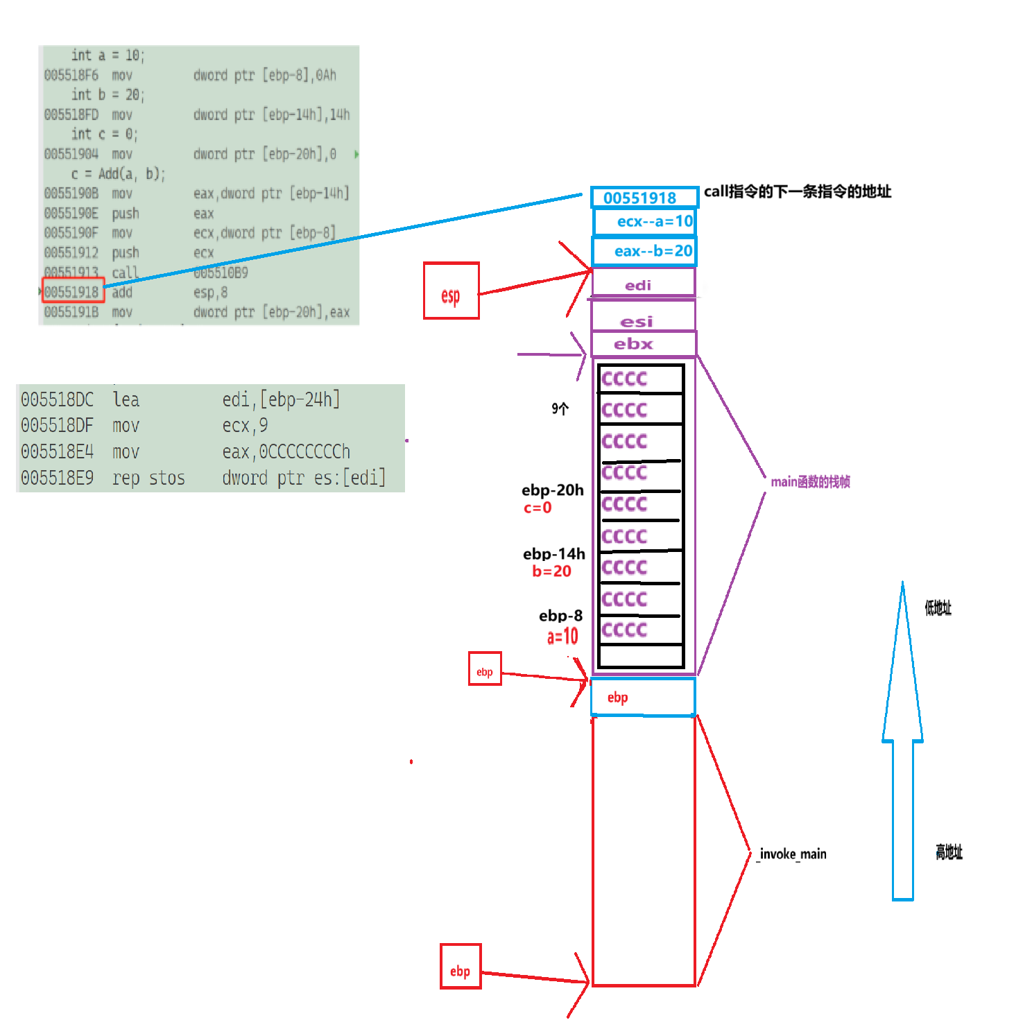 }我们可以将上面main函数的函数栈帧创建过程的主要部分单独拆解出来看看,代码如下