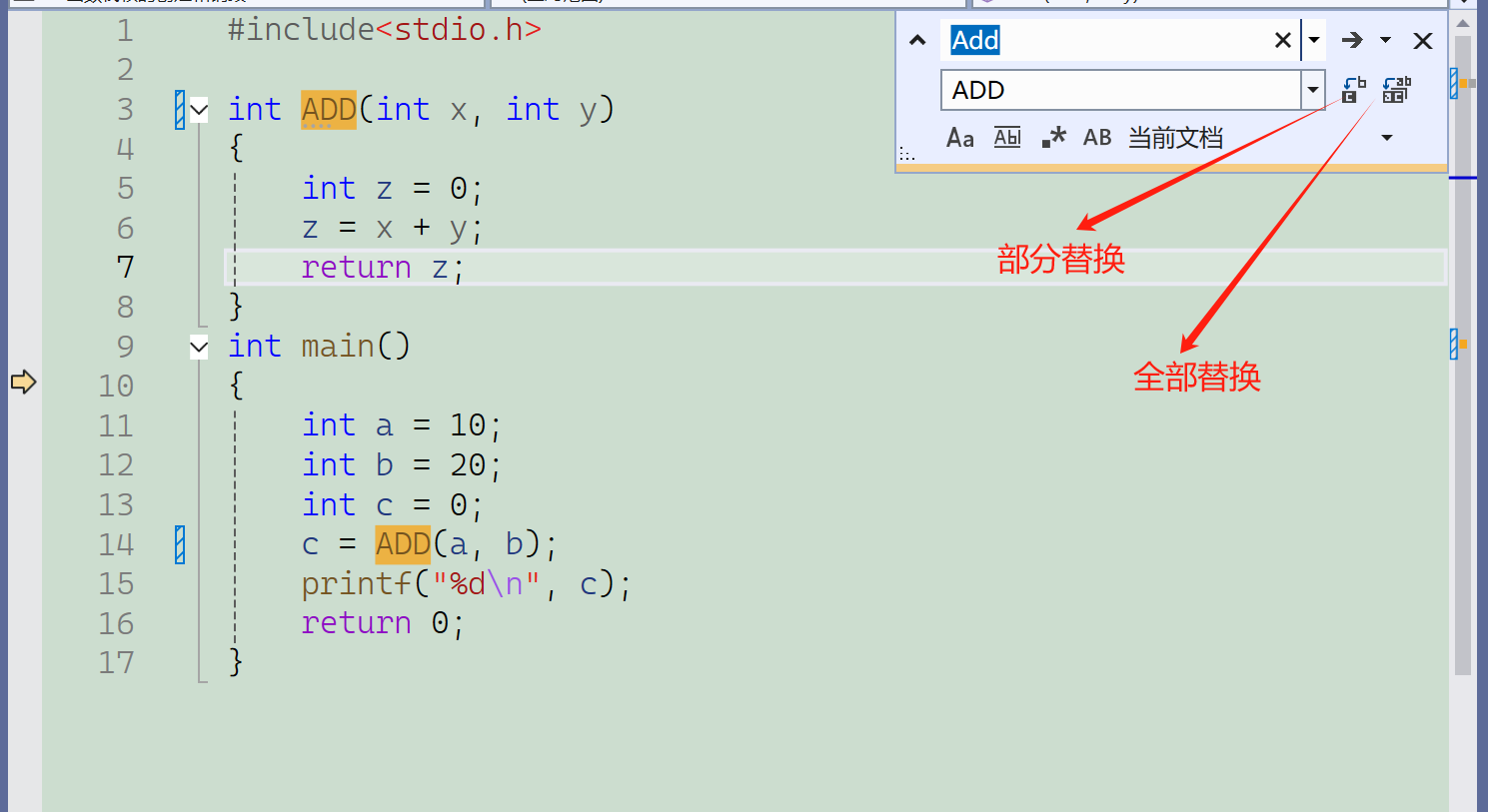 补充小技巧:通过快捷键CTRL+F可以进入搜索栏,你可以输入你想要查找的代码,并且还可以进行单个修改或者全部修改,如下图展示: