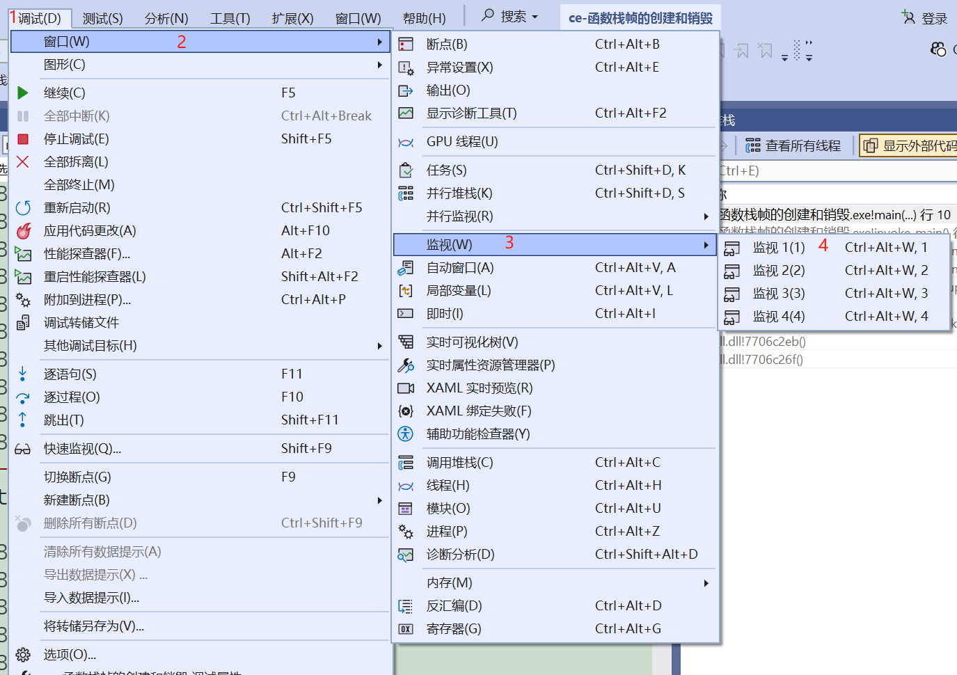 --按F10开始逐过程调试后(如果没打断点的话不要直接用F5,会直接调试到结束的),在菜单栏中【调试】->【窗口】->【监视】,打开任意一个监视窗口,输入你要观察的对象就可以了,具体操作如下图;