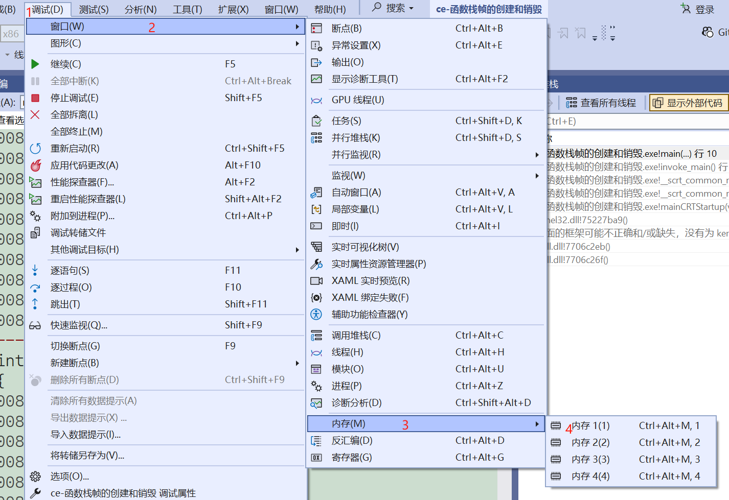 --如果监视还不能看仔细的话,也是可以观察变量在内存中的存储情况的,还是在调试后,在菜单栏中【调试】->【窗口】->【内存】,打开任意一个内存窗口,打开后在地址栏输入:arr,&num,&c这类地址,就能观察到该地址处的数据了