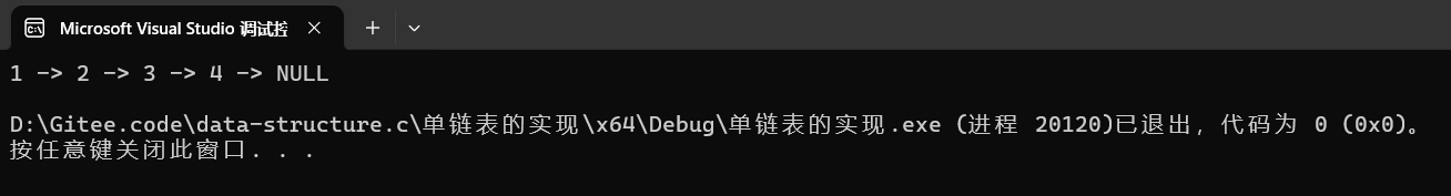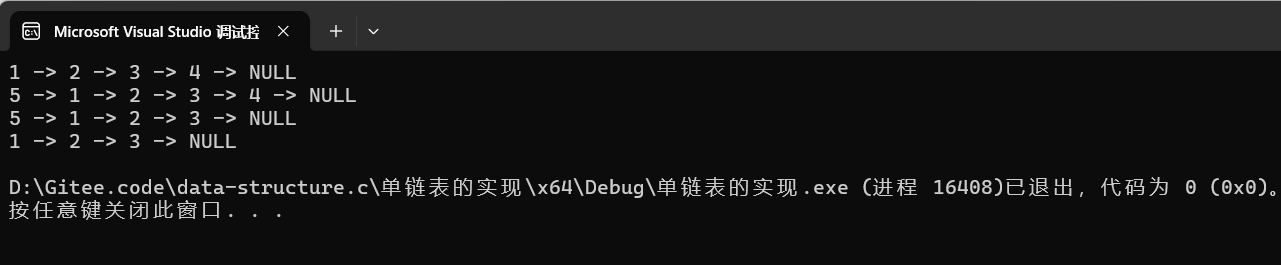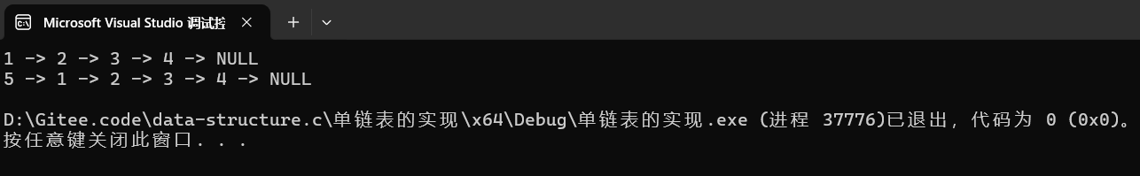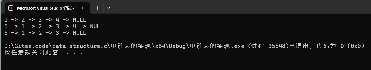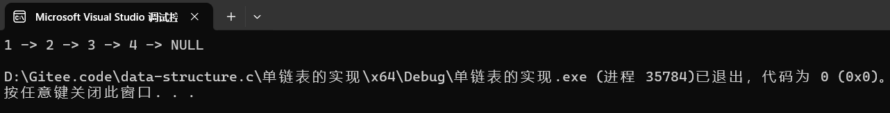 }--测试完成没问题,能正确打印出想要的链表 ,退出码为0。