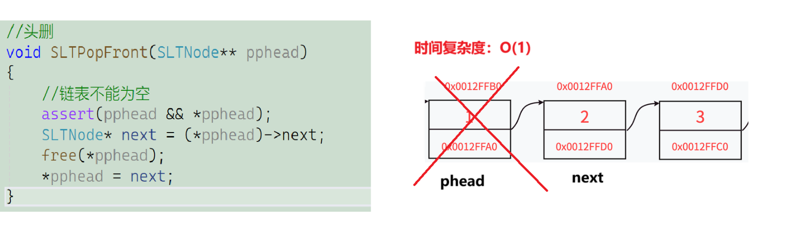 断言和尾删一样,这里主要就是先定义一个next记录phead的下一个节点,再直接free掉*pphead。最后让next成为新的头节点就可以了