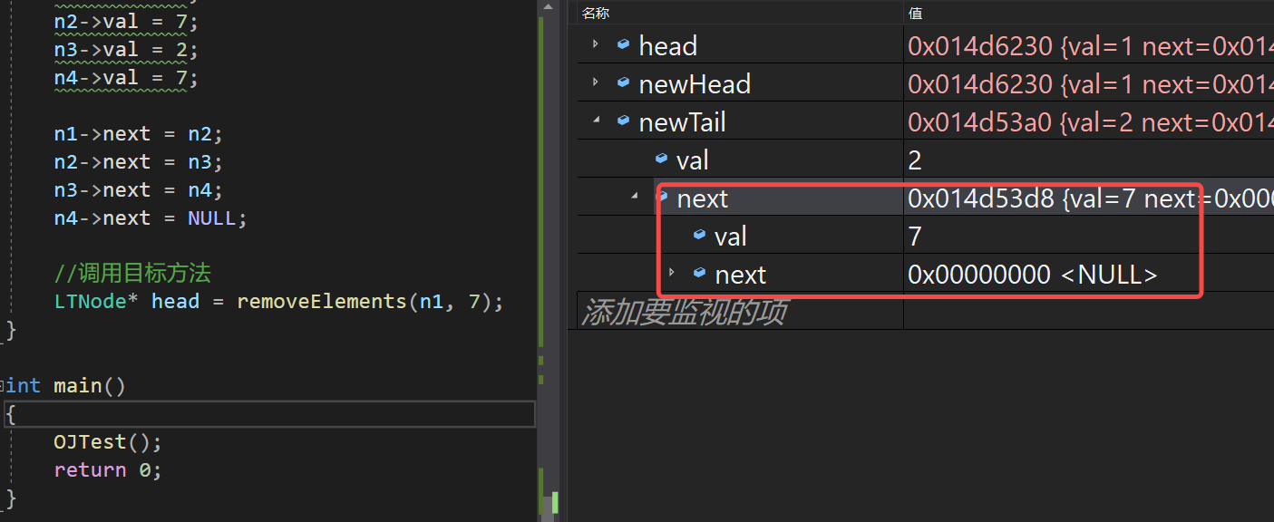 到这里我们就可以发现,按道理来说我们最后应该1->2->NULL,但是呢2的next是7,这就证明了我们需要把最后一个尾节点的next手动置空,不然它还保存着原来的next存放的地址,这就是调试的用处呢,那么我们后面这一题也会出现与这题类似的问题,大家也可以自己调试着看看