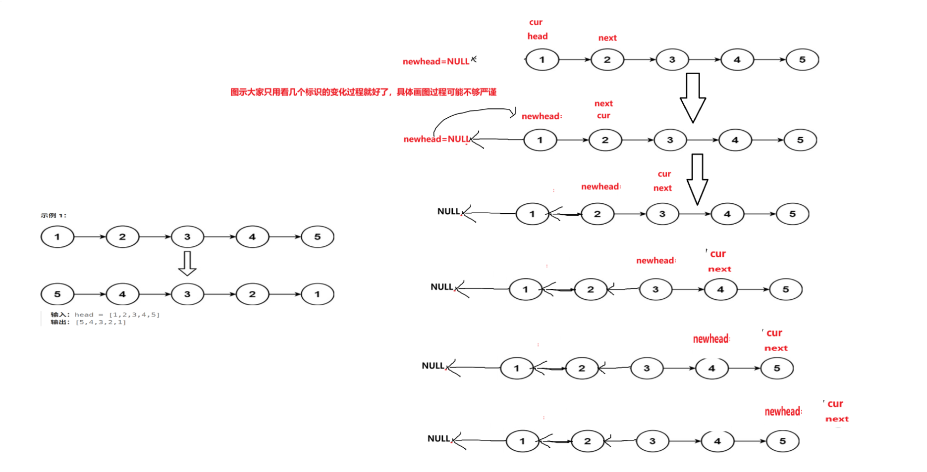 1.cur指向链表头结点,newhead初始化为空(用于存储反转后的新链表)