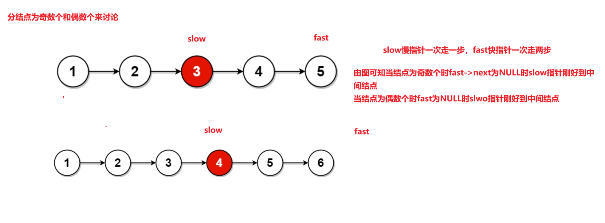 2.分两种情况讨论,当结点个数为奇数时我们可以发现fast->next为NULL时slow指针刚好走到中间结点,当结点个数为偶数时我们可以发现fast为NULL时slow指针刚好走到中间结点。